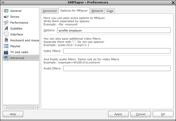Solution: Create a mplayer profile for SMPlayer different than the default one. Let’s call it “smplayer”. Place the following in ~/.mplayer/config:
