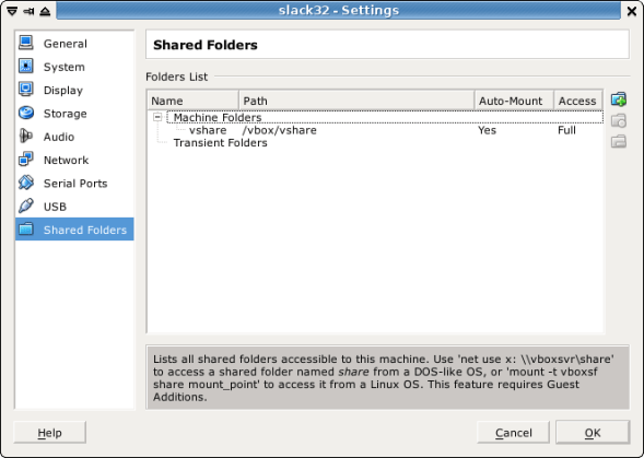 Posted: 2012-06-25 Filed under: system | Tags: share, virtualbox Leave a commentProblem: I have to use a virtual machine running Slackware32 to test build the scripts I maintain at SlackBuilds.org. Therefore I need an easy way to transfer the scripts and other files between the host and guest machines.