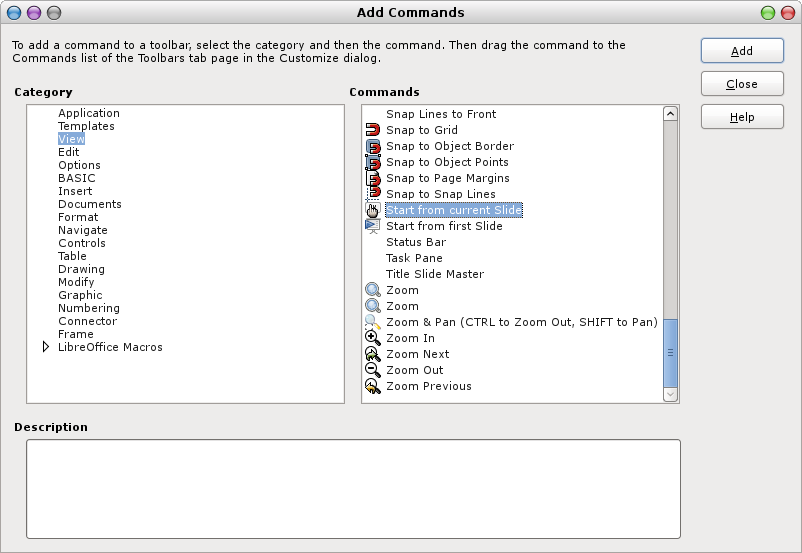 Posted: 2015-02-18 | Author: slackalaxy | Filed under: desktop, office | Tags: buttons, customize, impress, libreoffice, toolbar |Leave a commentI use LibreOffice and sometimes, when I go through a presentation I want to enter full screen mode from the current slide. This can be done by pressing SHIFT + F5, but I decided to put a button in the toolbar. To do this, right click on the toolbar you want to edit and select Customize Toolbar. Go to Toolbars > Add.