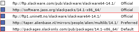 Therefore, I decided to use slapt-get to manage the installation of third party packages from SlackOnly 14.1-x86_64. It even has a nice graphical front end called gslapt, which can be used to specify mirrors with different priority. I set Slackware64 14.1 mirror as OFFICIAL, AlienBob’s multilib as PREFERRED and SlackOnly as DEFAULT: