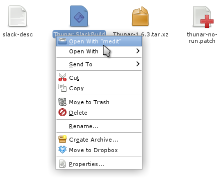 I decided to give it a try. My system is Slackware64 14.1, with XFCE 4.10 and Thunar 1.6.3. I downloaded the Thunar source, SlackBuild script and slack-desc file from a convenient mirror. I saved the patch (see below) to the same folder.