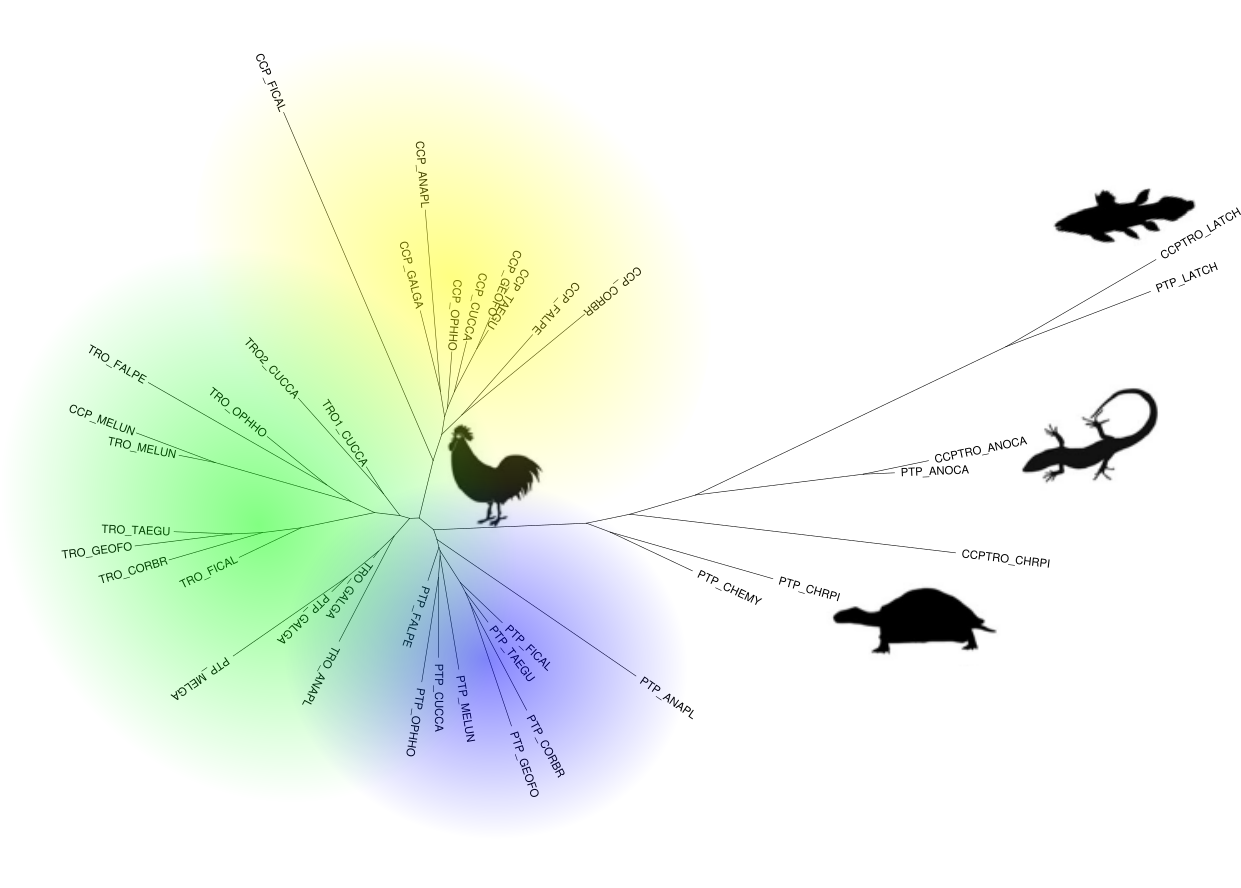The program can draw trees in several cool ways. Combined with the power of Inkscape, different clusters can be highlighted and species indicated to produce a figure such as: