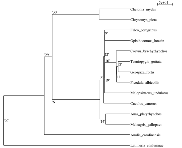 (Latimeria_chalumnae:412.98864059,(Anolis_carolinensis:279.65697667,(((Meleagris_gallopavo:79.95541635,Anas_platyrhynchos:79.95541635)'14':18.08745294,(Cuculus_canorus:85.20000000,((Melopsittacus_undulatus:82.45491770,((Ficedula_albicollis:43.70000000,(Geospiza_fortis:38.00000000,Taeniopygia_guttata:38.00000000)'13':5.70000000)'11':0.30000000,Corvus_brachyrhynchos:44.00000000)'10':38.45491770)'19':0.65432695,(Opisthocomus_hoazin:82.10000000,Falco_peregrinus:82.10000000)'9':1.00924465)'22':2.09075535)'8':12.84286929)'6':155.69133889,(Chrysemys_picta:100.65271923,Chelonia_mydas:100.65271923)'30':153.08148895)'29':25.92276848)'27':133.33166392);