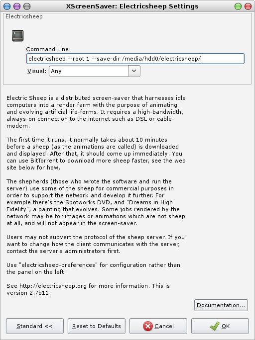 Posted: 2019-04-19 Filed under: desktop, media, system | Tags: electricsheep, xscreensaver Leave a commentI have Electricsheep installed and have selected it via XScreenSaver. However, my /home is on a SSD and I decided that maybe it is not a good idea to have the constantly evolving sheep stored in ~/.electricsheep. Therefore I looked for a way to specify a different directory.