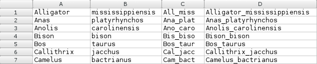 Posted: 2020-08-05 Filed under: academic, office | Tags: Cell values, function, gnumeric, left, shorten, spreadsheet Leave a commentI have a spreadsheet file with a list of species’ Latin names. I want to automatically create abbreviations for each species, by shortening both the genus and specific epithet to a certain number of characters. Here’s how to do it.