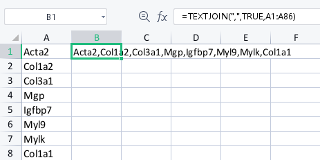 Posted: 2023-04-30 Filed under: office | Tags: Cell values, excel, gene, row, sc-type, spreadsheet, transpose Leave a commentI have a list of gene names in a spreadsheet column hat I need to transform to a row. Using the transpose function does not do the job, because gene names should be in a single cell, comma separated. So, I searched a bit and found the TEXTJOIN function.